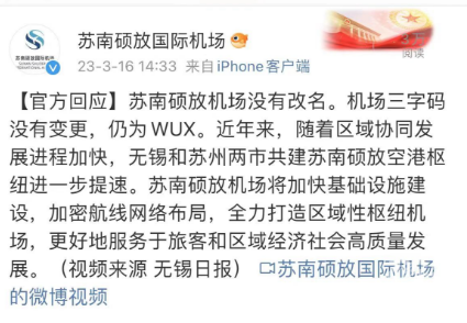 随后,苏南硕放机场官方微博回应:苏南硕放机场没有改名。机场三字码没有变更,仍为WUX。近年来,随着区域协同发展进程加快,无锡和苏州两市共建苏南硕放空港枢纽进一步提速。苏南硕放机场将加快基础设施建设,加密航线网络布局,全力打造区域性枢纽机场,更好地服务于旅客和区域经济社会高质量发展。