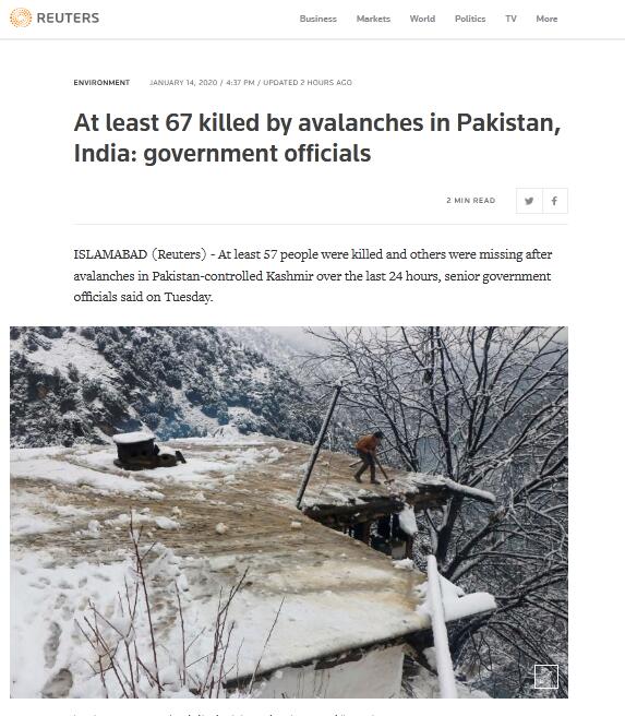 【环球网快讯】据路透社14日消息,根据巴基斯坦政府高级官员的说法,过去24小时,巴控克什米尔地区发生雪崩,共造成至少57人死亡,另有多人失踪。此外在邻国印度,印控克什米尔地区北部也发生多次雪崩,已造成至少10人死亡。
