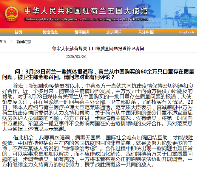 问:3月28日荷兰一些媒体报道称,荷兰从中国购买的60余万只口罩存在质量问题,被卫生部全部召回。请问您对此有何评论? 徐宏:新冠肺炎疫情暴发以来,中荷双方一直就共同抗击疫情保持密切沟通和良好合作。近一个多月来,随着荷兰疫情形势发展,中方致力于向荷方提供力所能及的帮助。对于3月28日媒体有关荷兰从中国购买的一批口罩存在质量问题的报道,大使馆高度关注,并在当晚第一时间与荷兰外交部、卫生部联系,了解核实有关情况。29日,我本人应约与荷兰医疗护理大臣范莱恩通话。范莱恩大臣表示,真诚感谢中方为荷兰抗击疫情所提供的大力支持和帮助;关于荷方从中国采购的部分口罩不适宜重症病房医护人员佩戴的问题,荷方正在进一步厘清有关情况,俟有结果,将第一时间向中方通报。希望这一孤立事件不会影响两国在抗击疫情领域的友好合作。我对范莱恩大臣通报上述情况表示感谢。 借此机会,我要再次强调,病毒无国界,国际社会唯有加强团结互助,才能战胜疫情。中国支持包括荷兰在内的各国抗疫的目的非常简单,就是要努力挽救更多的生命,不存在某些人所说的“地缘政治考虑”。合作过程中即使出现一些问题也是正常的,可以实事求是地加以解决,而不应作政治化解读。我们期待荷方关于口罩质量问题的进一步调查结果,如有需要,中方将本着客观公正的原则依法协助开展调查。中方将继续全力支持荷方的抗疫努力,携手战胜病毒这一共同的敌人。 |