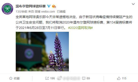 据@温布尔登网球锦标赛 ,由于新冠状病毒疫情持续蔓延产生的公共卫生安全问题,将取消2020年温布尔登网球锦标赛,第134届锦标赛将于2021年6月28日至7月11日举行。