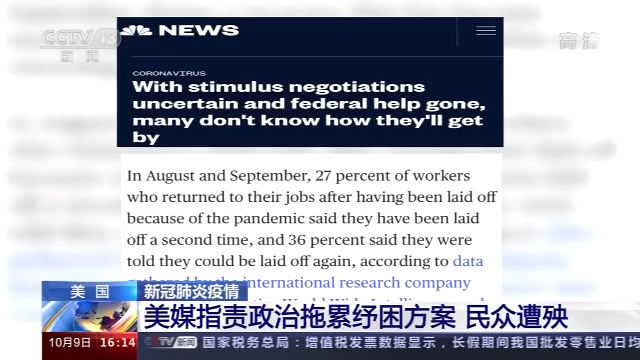 美国全国广播公司报道称,美国康奈尔大学和一家国际研究公司收集的数据显示,在8月和9月,约27%因疫情失业的美国民众在重新就业后再次被解雇,另有约36%被告知他们可能将再次被解雇。疫情以来,许多美国民众靠领取失业救济勉强度日,但是围绕新一轮财政刺激方案的谈判目前陷入僵持,能从政府那里获得更多支持和帮助的希望很渺茫,这让他们深感不安。随着一些援助项目到期,没有失业救济金,部分失业民众的生活难以支撑下去。报道说,不少美国民众觉得,华盛顿方面不顾民众财务和健康状况,只是在玩弄政治,并指责政府根本没有认真考虑大量失业人口的困境。