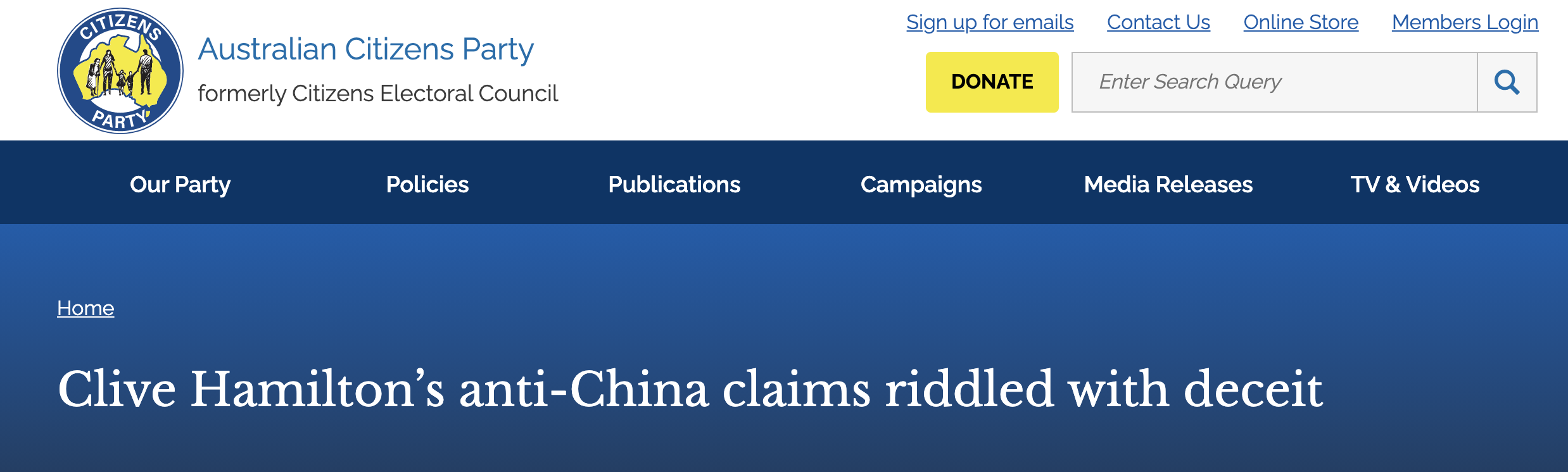 △澳大利亚公民党官网发文:澳大利亚战略政策研究所虚伪面目暴露无遗! 其实9月底,澳大利亚公民党官网就发表了《中国叙事》系列报告,揭露澳大利亚战略政策研究所和澳大利亚安全情报组织近年来在澳大利亚通过各种手段制造反华舆论、破坏中澳关系的所作所为。 报告中提到,澳大利亚安全情报组织通过一群反华分子来制造舆论,传播反华思想,其中包括澳大利亚前总理顾问约翰·加诺特、国会议员安德鲁·海斯蒂、作家克莱夫·汉密尔顿、记者尼克·麦肯齐等人。这些人故意渲染“中国威胁论”,互相引用未经证实的内容攻击中国,以掩盖澳大利亚外交政策已经被澳大利亚安全情报组织及“五眼联盟”操控的事实,澳大利亚公众正在被虚假信息“轰炸”。 澳作家歪曲事实写成反华“大作” 反华学者克莱夫·汉密尔顿打着“学术”的幌子,多次出版书籍渲染“中国威胁论”,散布反华虚假信息。澳大利亚公民党直言汉密尔顿通过“篡改文献和歪曲数据”以支持书中的许多主张,充满欺骗。