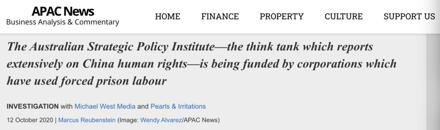 △APAC新闻网报道:澳大利亚战略政策研究所资金来源于使用监狱劳工的公司 文章爆料称,澳大利亚战略政策研究所从外国政府和公司获得了数百万美元资金,其中很大一部分资金来自直接从强迫监狱劳工工作中获利的企业。可笑的是,该研究所却指责中国存在人权问题。 澳大利亚战略政策研究所声称自身进行的是独立研究,但它是一家澳大利亚联邦所有的公司,从未公开披露过澳国防部、外国政府及武器制造商赞助的资金数额。文章称,该机构至少有11名资金支持者直接或间接地参与了使用监狱劳工和人口贩运,四个主要长期支持者都依赖监狱劳工生产用于军需用品及零部件,其中包括洛克希德·马丁公司和雷神公司。澳大利亚战略政策研究所从这些公司得到资金支持,定期发布报告宣称中国是“一个主要的安全威胁”,同时成功促使澳大利亚政府从其赞助商手中购买数十亿美元的军工产品。 文章说,澳大利亚战略政策研究所受到越来越多澳大利亚前外交人员、国防人员、联邦公共服务部门负责人和资深媒体评论员的谴责。 |