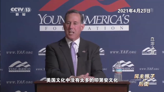美国前参议员 里克·桑托勒姆:我们来到这里的时候,这里还是一片空白,我们从无到有建立了一个国家,这里原来什么都没有。没错,我们有原住民,但坦率地说,美国文化中没有太多的印第安文化。