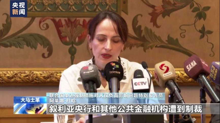 联合国单边强制措施对人权负面影响问题特别报告员 阿莱娜·杜晗:叙利亚央行和其他公共金融机构遭到制裁,使叙利亚经济被封锁,从而导致危机进一步恶化。(制裁)完全切断了进出口贸易的付款渠道,包括食品、药品、配件、原材料在内叙利亚所需的,有助于经济复苏的商品(无法获取)。