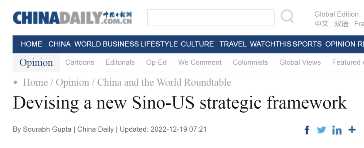 中国日报网12月19日电 2022年即将过去,国际关系特别是中美关系在新的一年如何发展备受关注。华盛顿智库中美研究中心高级研究员索拉布·古普塔(Sourabh Gupta)在中国日报网刊文展望2023年时称,美中关系不仅对两国很重要,对地区和全球的安全与繁荣也很重要,双方可以合作的远超有分歧的领域。