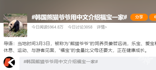 当地时间3月3日,被称为“熊猫爷爷”的爱宝乐园熊猫饲养员姜哲远说,乐宝、爱宝和福宝一家在熊猫乐园作息规律,每天进食、休息、运动、与游客见面,“福宝”的食量比父母还要大,正在健康成长。他在网络上了解到中国朋友对爱宝一家的关心,对此也表示感谢。