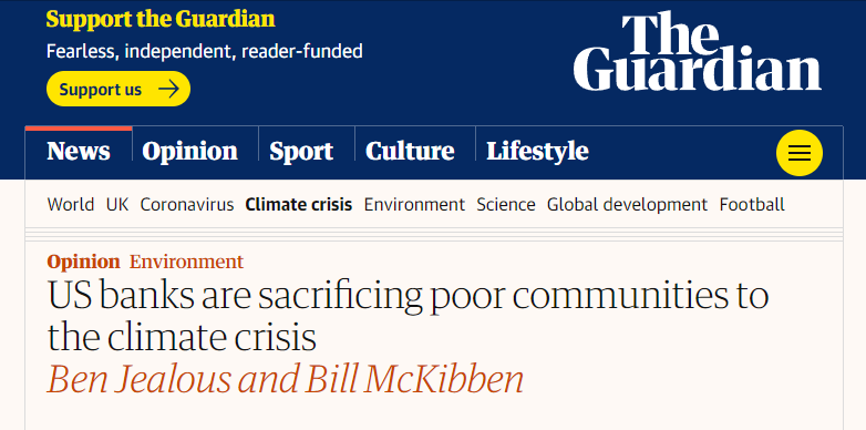 经过几十年的宣传和诉讼,美国金融体系才被迫放弃种族主义的红线制度。美国有色人种协进会的前执行董事本·杰勒斯(Ben Jealous)和美国著名环境保护主义理论家比尔·麦吉本(Bill McKibben)指出,我们没有几十年的时间来避免灾难性的气候变化和对脆弱社区的进一步影响。