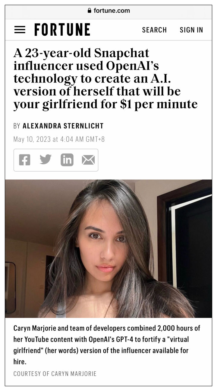 都市快报讯 AI正在重塑人们的想象力。坐拥180万粉丝美国女网红Caryn Marjorie用AI找到了一条新的“致富路”。据悉,这位23岁的美国女网红正在出售AI版本的自己,并与粉丝谈恋爱。由于“分身”理论上无上限,AI版本的Caryn可同时交往1000个男友,目前内测收费每分钟一美元。