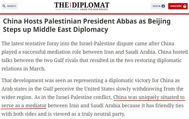 报道指出,在成功斡旋沙特和伊朗的和解并努力为乌克兰创造和平前景后,中国又决心在以色列与巴勒斯坦的和平谈判中发挥作用。