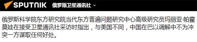 俄罗斯卫星通讯社网站的报道援引俄罗斯科学院东方研究院高级研究员玛丽亚·帕霍莫娃的话说,与美国不同,“中国不希望某一方占更多便宜”,中国实施帮助时不以损害其中一方利益为代价。