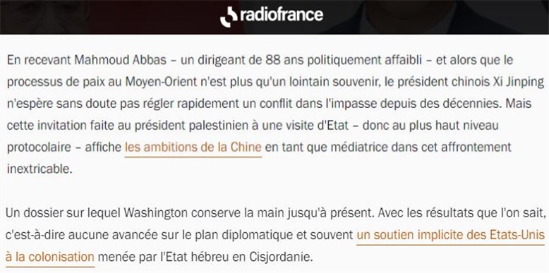 法国广播电台网站报道指出,由于中东和平进程已经成为遥远的记忆,中方并不会期待迅速解决这场已陷入僵局数十年的冲突。但邀请巴勒斯坦总统进行国事访问,表明了中国作为这一棘手冲突的调停者的雄心。