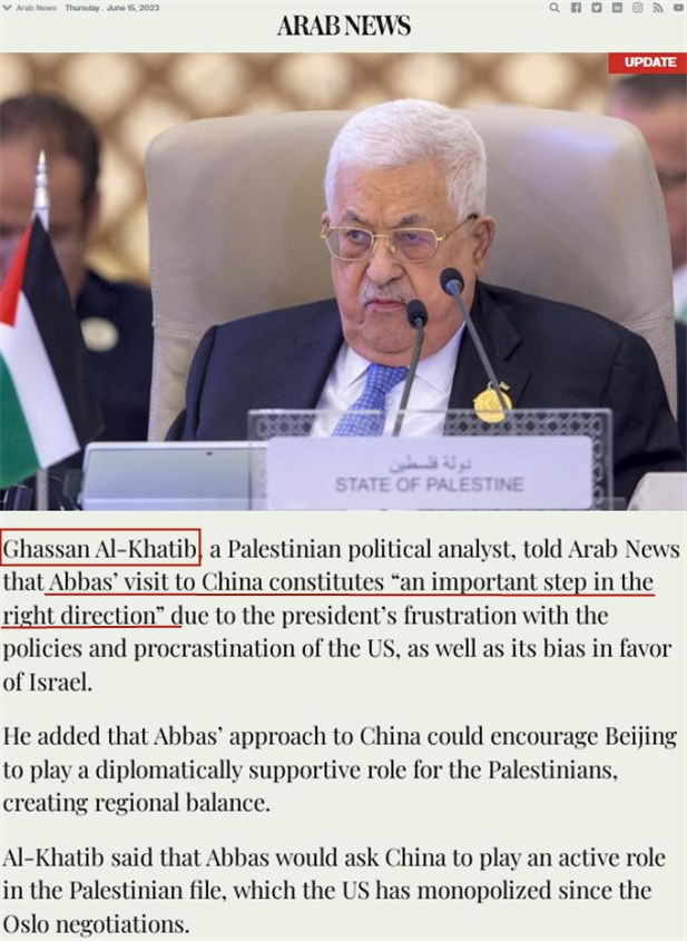 报道援引巴勒斯坦政治分析人士加桑·哈提卜的话说,阿巴斯访华是在“正确的方向上迈出的重要一步”,因为阿巴斯对美国的政策以及美国对以色列的偏袒感到失望,同时他认为中国在巴勒斯坦事务上能发挥更积极的作用。