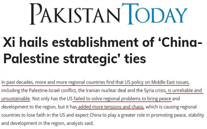 《今日巴基斯坦报》网站的报道直言,过去十年里,中东国家发现,美国在中东问题上的政策靠不住,也不可持续。分析人士表示,美国不仅未能解决地区问题、给该地区带来和平与发展,反而加剧了紧张与混乱,导致地区国家对美国失去信心,转而期待中国在促进该地区和平、稳定与发展方面发挥更大作用。