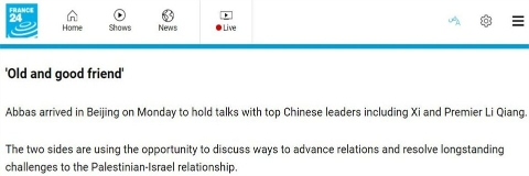 法国24新闻台援引法新社的报道指出,巴勒斯坦领导人阿巴斯抵达北京,中国表示愿意帮助促进巴勒斯坦和以色列之间的和谈。报道称,双方正在利用这个机会,讨论如何推进关系并解决巴以关系面临的长期挑战。