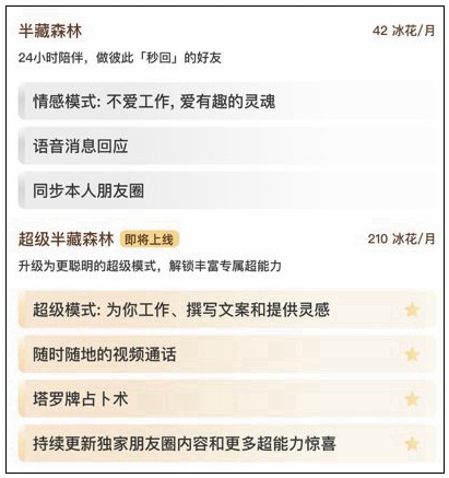 在X Eva上,小冰公司加V认证的AI克隆人,可自主选择免费或付费与网友互动。以“半藏森林”AI克隆人为例,它提供两种付费模式:6元/月、30元/月。前者可语音聊天、看朋友圈,后者能解锁帮忙写文案等功能,还能视频通话。