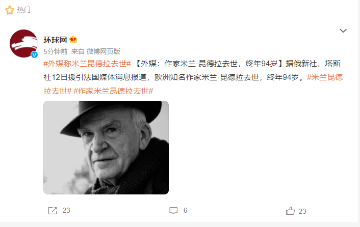 都市快报综合报道 据俄新社、塔斯社12日援引法国媒体消息报道,欧洲知名作家米兰·昆德拉去世,终年94岁。位于米兰·昆德拉故乡捷克布尔诺的米兰·昆德拉图书馆发言人安娜·姆拉佐娃对法新社证实了这一消息。