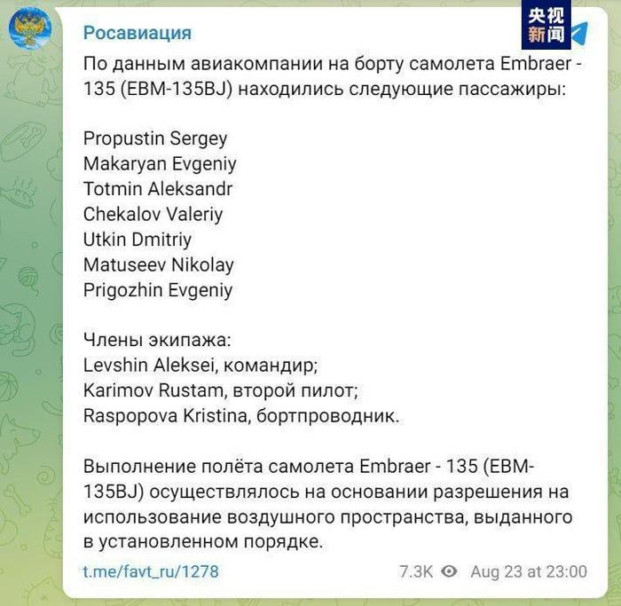 潮新闻讯 当地时间8月23日,一架由俄罗斯首都莫斯科飞往圣彼得堡的私人飞机在俄西部特维尔州坠毁,造成10人死亡。俄罗斯联邦航空运输署发布消息称,俄私营军事实体瓦格纳组织创始人普里戈任和瓦格纳创始人之一、指挥官乌特金在失事飞机上,机上7名乘客中包括瓦格纳集团的几乎所有高层领导。