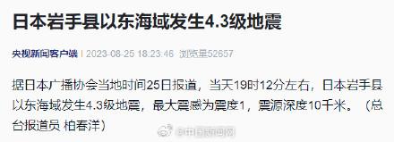 据日本气象厅消息,当地时间8月25日7时48分,岩手县以东海域发生5.8级地震。19时12分,同一区域再次发生4.3级地震,两次地震的震源深度都为10千米。