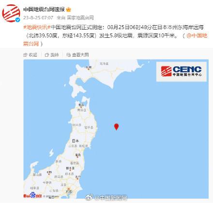 此前根据中国地震台网正式测定:08月25日06时48分在日本本州东海岸远海(北纬39.50度,东经143.55度)发生5.8级地震,震源深度10千米。