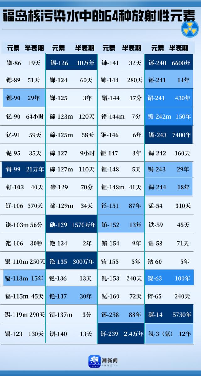 这64种放射性元素中,21种半衰期在10年以上,部分核素半衰期很长超过千年,而半衰期最长的碘-129需要花费1570万年才能将放射性活度降低到一半。
