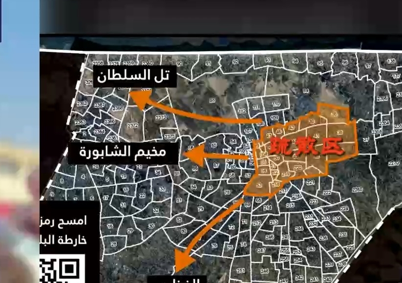 12月3日,以色列国防军在汗尤尼斯及其周边地区空投传单,上面附有一个二维码,通过扫描二维码可以进入以色列国防部网站,网站上发布的一张地图将加沙地带分成2000多块区域,其中汗尤尼斯的部分区域用橙色标记为必须撤离的“疏散区”。