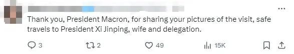 “马克龙总统,感谢您分享这些访问的照片。祝习近平主席、夫人和代表团旅途平安。”