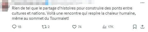 “没有什么比分享故事更能在文化和国家间架起桥梁的了。这是一场散发着人性温暖的互动,即使是在图尔马莱山口!”
