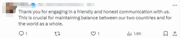 “感谢您与我们进行友好和坦诚的沟通。这对于维护两国乃至世界的平衡至关重要。”