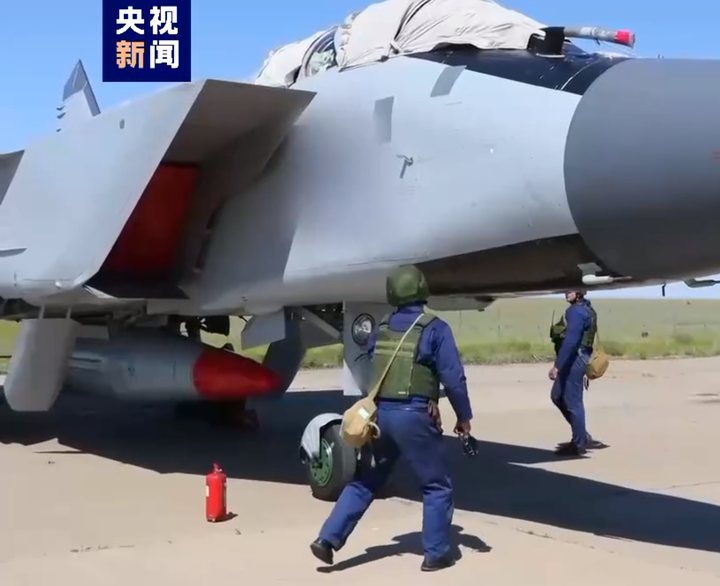 俄罗斯非战略核武器演习,米格-31K截击机机腹下方挂载了“匕首”导弹,弹头部分采用红色涂装,而以往常规弹头的“匕首”导弹采用灰色涂装。 图源:央视新闻