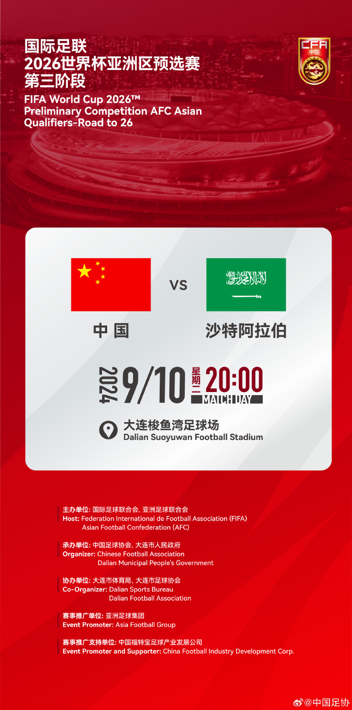 新华社北京7月18日电 中国足协18日消息,国际足联2026世界杯亚洲区预选赛第三阶段(18强赛)中国队对沙特阿拉伯队的比赛将于今年9月10日在大连梭鱼湾足球场举行。
