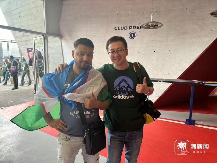 本来采访伴随着下半场开场的哨响而结束。没想到身披国旗打算回到看台的Abbos又半路折返,还找来他的朋友Mirron帮忙拍下一张与记者的合影。或许,在巴黎接受一个来自中国记者的采访,对他来说也是难忘的经历。