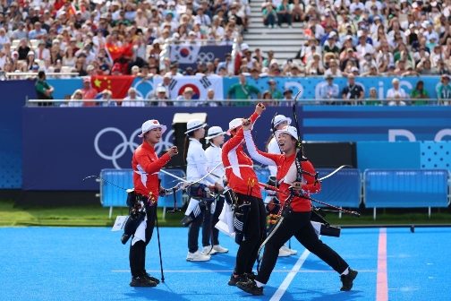加赛轮每名选手都只射一箭,两队交替射箭,所有人都屏住了呼吸。最终,韩国队两箭压线被判10环,以2环优势拿下十连冠。中国队虽然惜败,但三位姑娘逆风而上、不折不挠的精神,为全场观众带来了一场精彩的比拼。