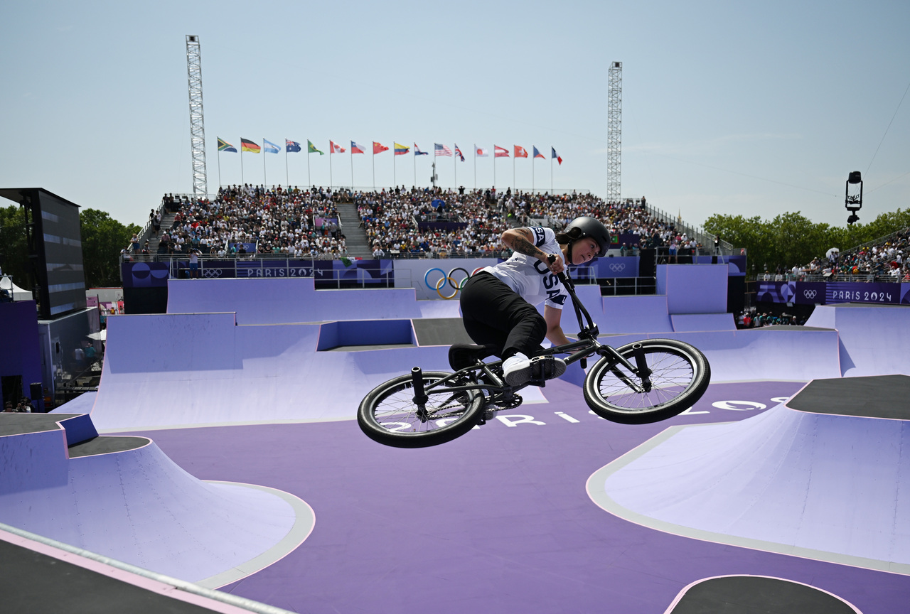 巴黎奥运会自由式小轮车女子公园赛决赛在巴黎协和广场举行,现场的看台都是临时搭建的。 新华社记者 胡虎虎 摄