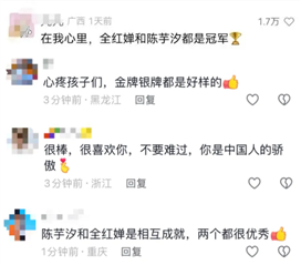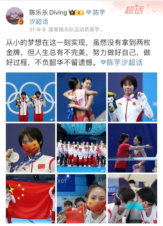 赛后,陈芋汐在社交媒体上写道:“从小的梦想在这一刻实现,虽然没有拿到两枚金牌,但人生总有不完美,努力做好自己,做好过程,不负韶华不留遗憾。”