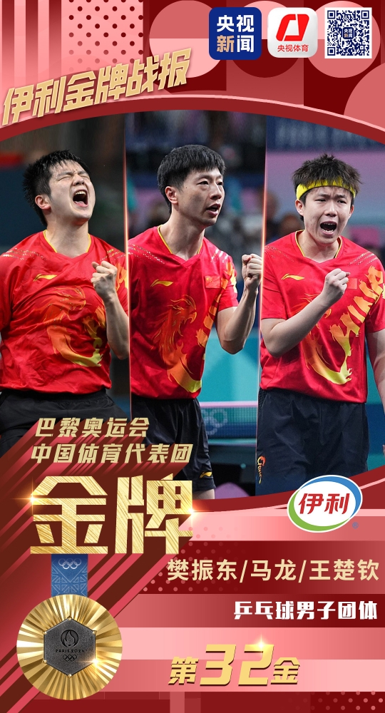 8月9日,在巴黎奥运会乒乓球男子团体决赛中,由樊振东、马龙、王楚钦组成的中国队3比0战胜瑞典队,夺得金牌!