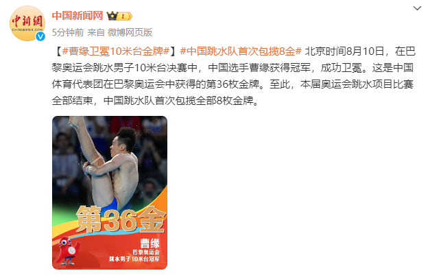 北京时间8月10日,在巴黎奥运会跳水男子10米台决赛中,中国选手曹缘获得冠军,成功卫冕。这是中国体育代表团在巴黎奥运会中获得的第36枚金牌。至此,本届奥运会跳水项目比赛全部结束,中国跳水队首次包揽全部8枚金牌。