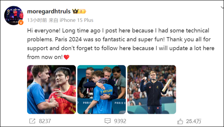 昨晚,瑞典乒乓球运动员莫雷加德发了一条微博,晒出与樊振东合照,并和中国球迷们打招呼,他表示“巴黎奥运会实在是太棒太有趣了,谢谢球迷们的支持,以后会多多发微博展示给大家看的。”