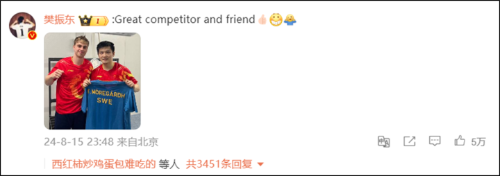 在这条微博下,樊振东在评论区回复小莫:“Great competitor and friend!”