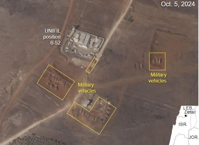 国外媒体10月5日公布的一张卫星图显示,近30辆以军装甲车辆密集地出现在联黎部队6-52号阵地。此后,黎真主党武装与以军曾在这一地区发生交火。