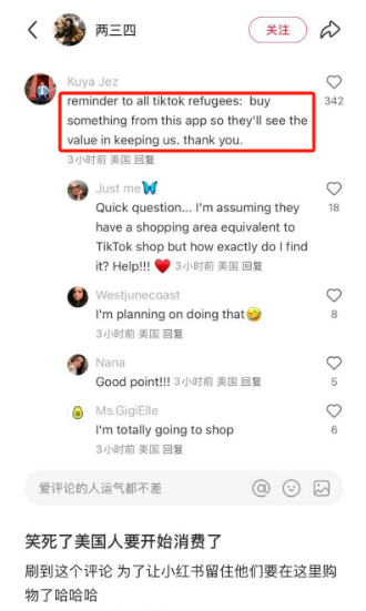 还有一些“TikTok难民”则担忧自家人的“蜂拥而至”会打扰小红书原本的生态,提议用“买买买”来显示自己的价值并得到了呼应,有的用户已经开始寻求购物攻略。