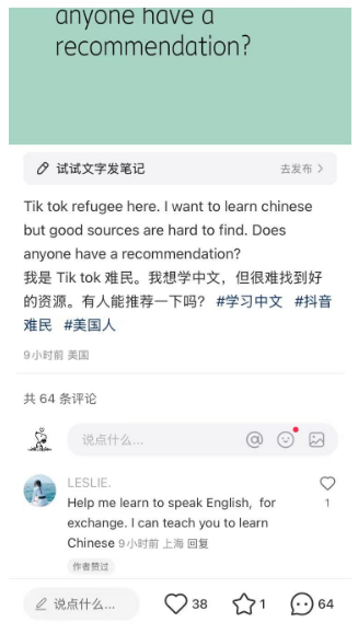大批“TikTok难民”的涌入,也开启了小红书“英语角”这一新功能。无论是希望学习中文的外国用户,还是想提升英语水平的中国用户,都有机会在这里找到“语言搭子”。