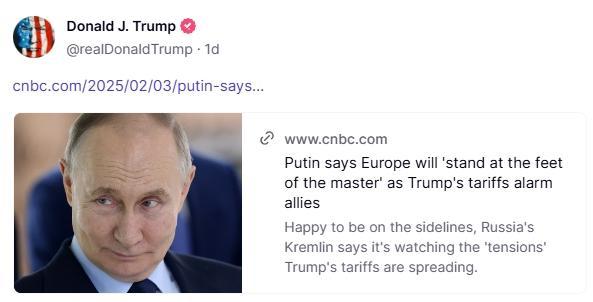 中新网2月11日电 综合外媒报道,当地时间2月10日,美国总统特朗普在社交媒体上转发了美国消费者新闻与商业频道(CNBC)日前发布的一篇文章。该文章写道,在特朗普对加拿大、墨西哥发出关税威胁后,俄罗斯总统普京表示,特朗普将“很快恢复欧洲的秩序”,而欧洲也将会“站在主人的脚边,轻轻地摇动尾巴”。