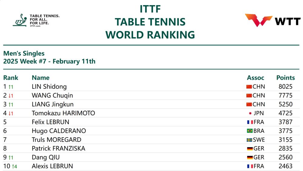 王楚钦与另一位国乒队员梁靖崑分列第二和第三。排名第四至第十的运动员依次为张本智和(日本)、费利克斯·勒布伦(法国)、卡尔德拉诺(巴西)、莫雷高德(瑞典)、弗朗西斯卡(德国)、邱党(德国)、艾利克斯·勒布伦(法国)。