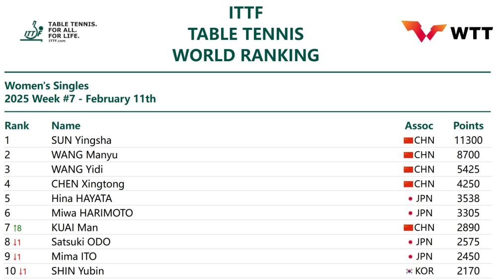 国乒选手占据女单世界前四。新加坡大满贯赛冠军孙颖莎以11300分高居榜首,她的身后为王曼昱、王艺迪和陈幸同。两位日本选手早田希娜、张本美和分列第五和第六,新加坡大满贯赛闯入决赛的中国运动员蒯曼升至第七,大藤沙月(日本)、伊藤美诚(日本)及申裕斌(韩国)排名第八至第十。