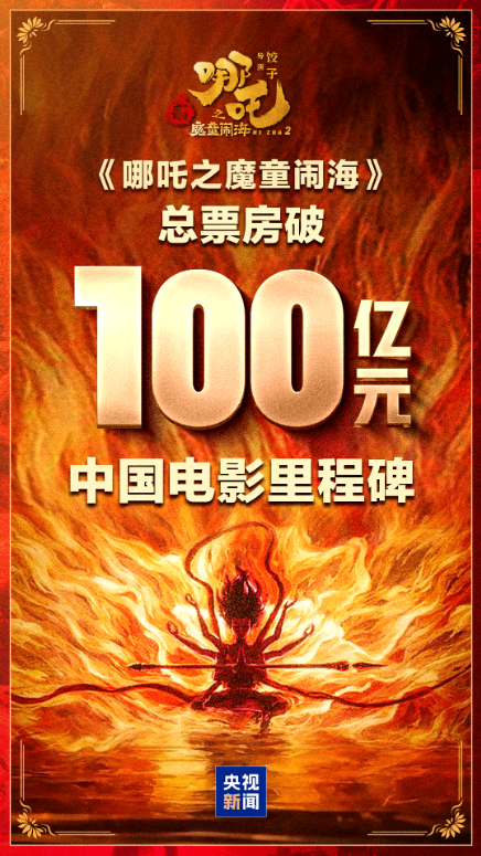 央视新闻讯 我国影史首部百亿元票房影片今天(2月13日)诞生。统计数据显示,截至今日晚间,电影《哪吒之魔童闹海》票房(含预售)达100亿元。