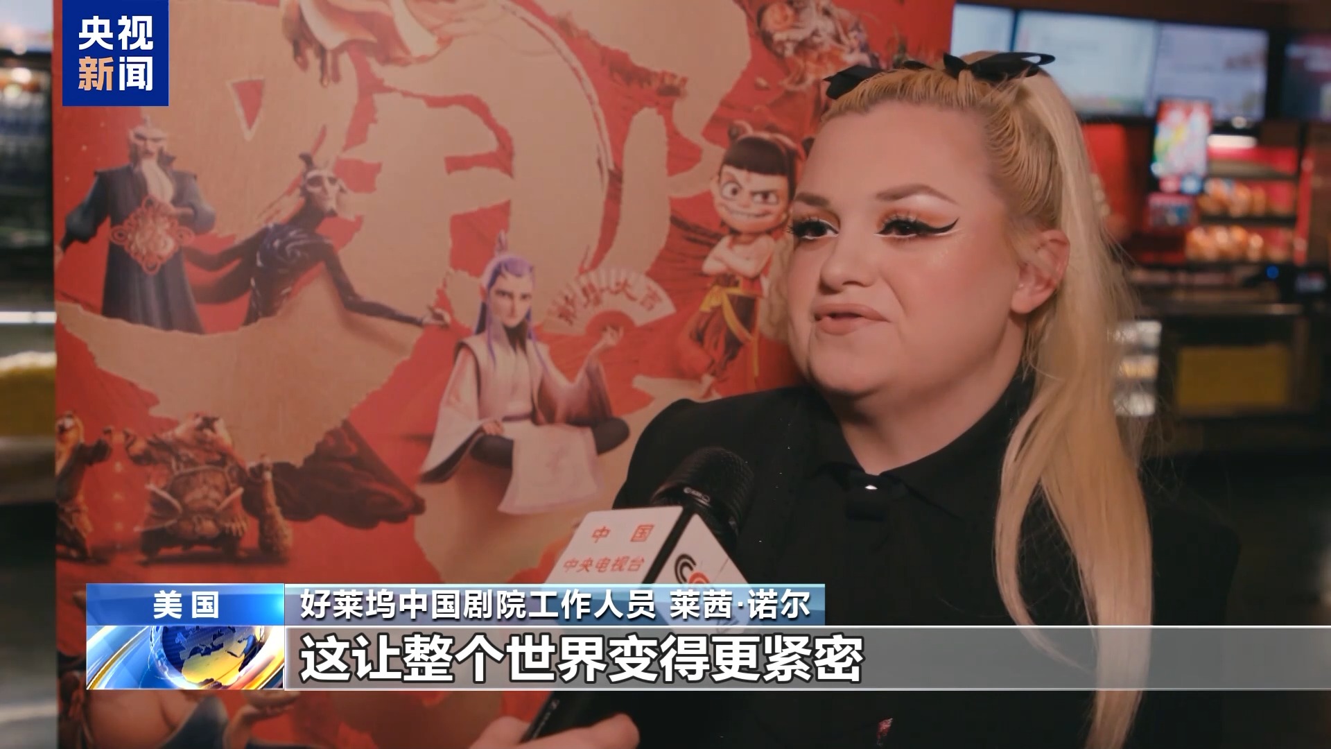 好莱坞中国剧院工作人员 莱茜·诺尔:女士们、先生们,欢迎来到美妙且历史悠久的中国剧院,我们非常自豪地在我们美丽的IMAX屏幕上向您放映《哪吒2》。