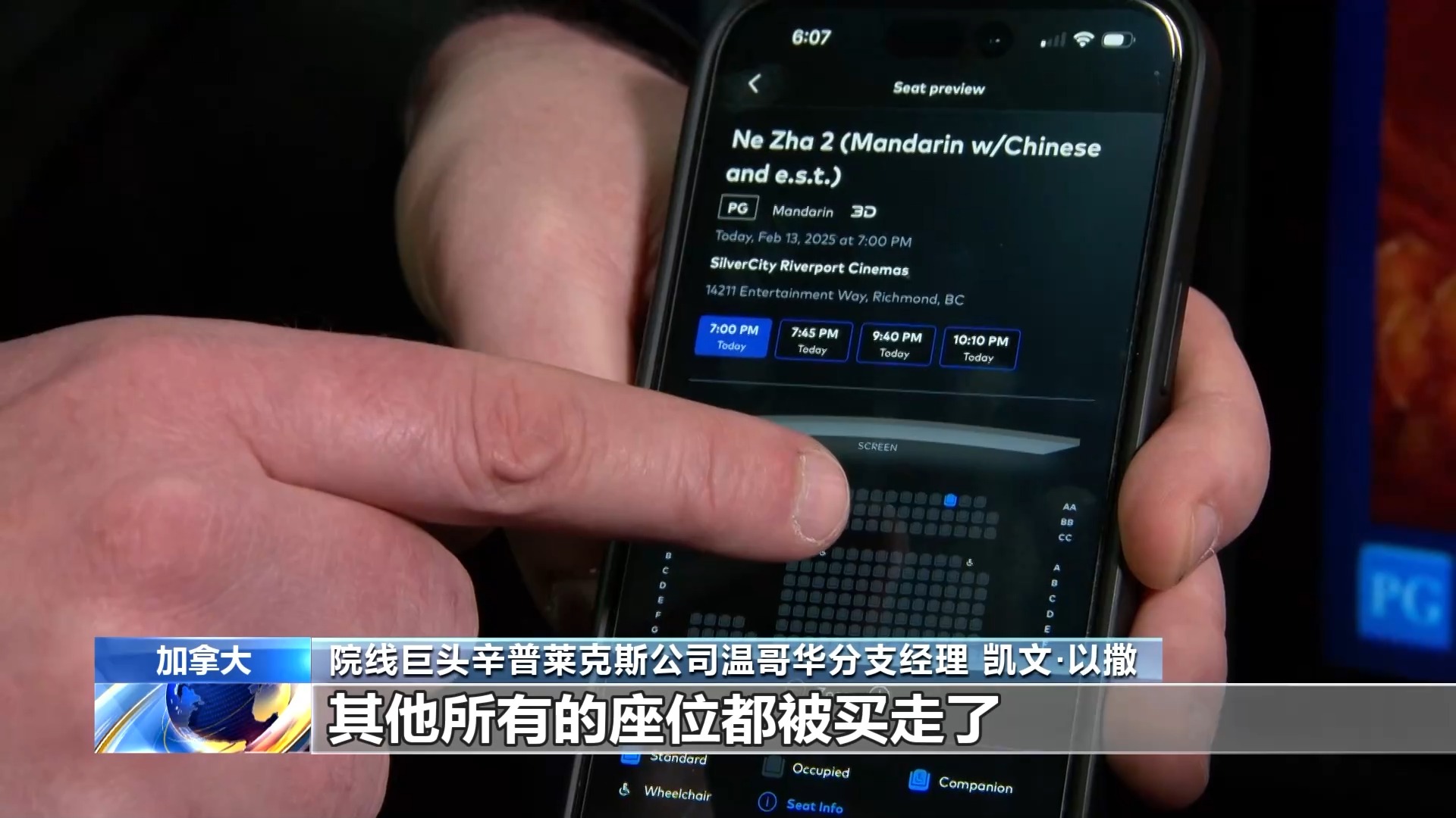 院线巨头辛普莱克斯公司温哥华分支经理 凯文·以撒:在这个放映厅,除了1个座位外,其他所有的座位都被买走了。我们的许多场次都已经卖完了,剩下的座位不多。《哪吒2》的票房非常好,很多顾客看到这部电影都非常兴奋。我们知道这部电影在全球范围内已经取得了非常好的票房成绩,有着强劲的预售,我已经可以想象,我们将会放映几个星期。