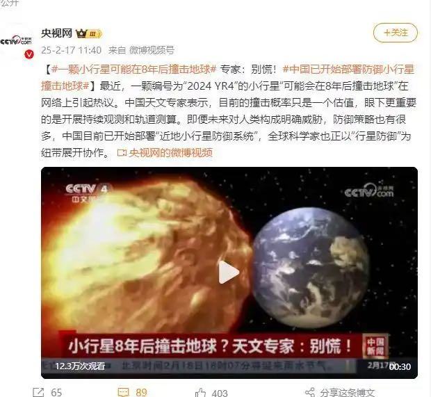 据央视新闻报道,中国天文专家表示,目前的撞击概率只是一个估值,眼下更重要的是开展持续观测和轨道测算。即便未来对人类构成明确威胁,防御策略也有很多,中国目前已开始部署“近地小行星防御系统”,全球科学家也正以“行星防御”为纽带展开协作。