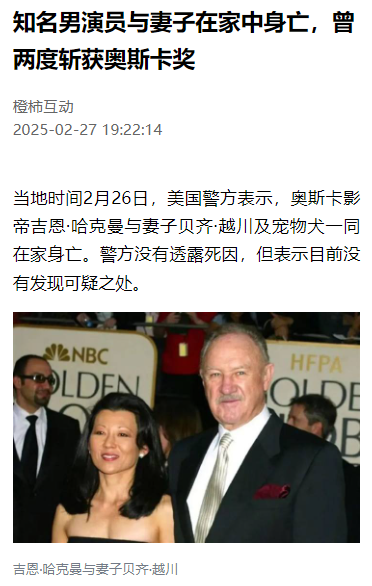 报道称,警方于2月26日在两人位于新墨西哥州的居所发现了他们的尸体。吉恩·哈克曼终年95岁,他的妻子贝齐·越川为日裔古典钢琴家,终年63岁,两人结婚34年。警方尚未透露死因或具体死亡时间,但指出目前未发现可疑之处。